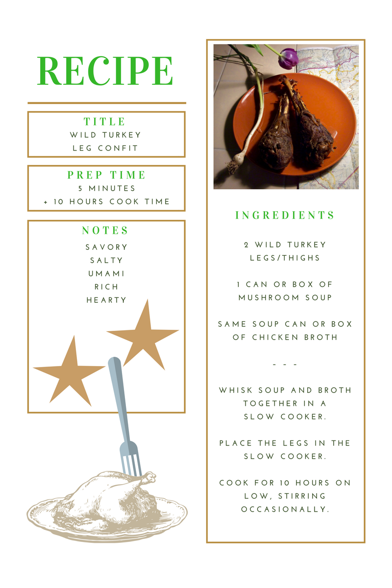 One of the biggest challenges to overcome with wild turkey meat is the toughness. This recipe slowcooks the darkest meat on the turkey for 10 hours, until it falls off the bone.