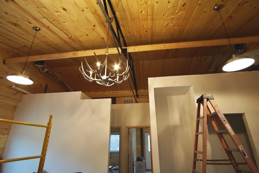 Yes, that’s an antler chandelier. The paint hadn’t dried before Chris was persuading our electrician, Z, to come back for the electric “finish”: hanging fixtures, putting plates on sockets and switches, testing, and tweaking. Z obliged, and we were almost ready for electric inspection, with the exception of the water heater.