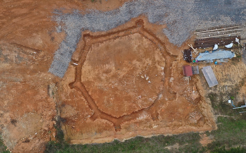 Our excavation crew dug the footer trenches. Now we had a decagon-shaped moat on the dome pad.