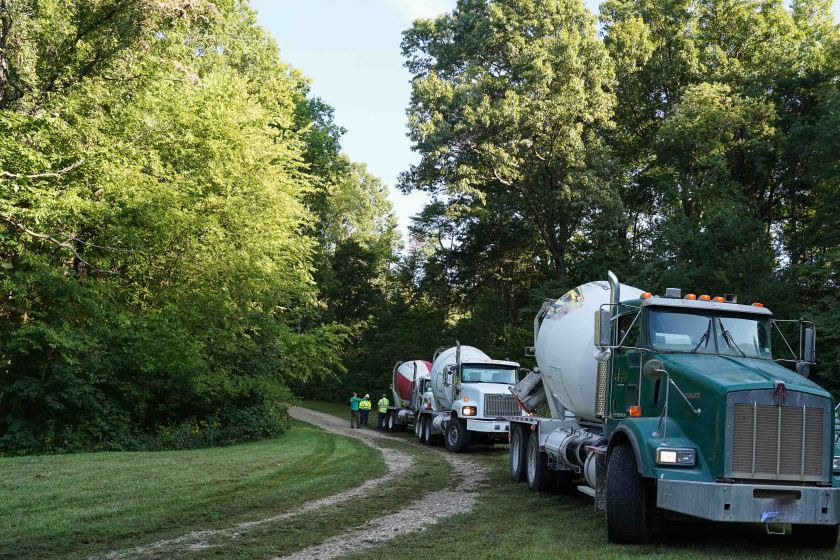 At 7:25, minutes before sunrise, the first concrete truck rumbled onto the scene, spinning its butt to mix all the components of the concrete inside. Doug scheduled the trucks to arrive every 20 minutes, but he had them add “plasticizer” to the concrete mix in case there was a hitch and the trucks had to wait. Plasticizer keeps the concrete from hardening up.