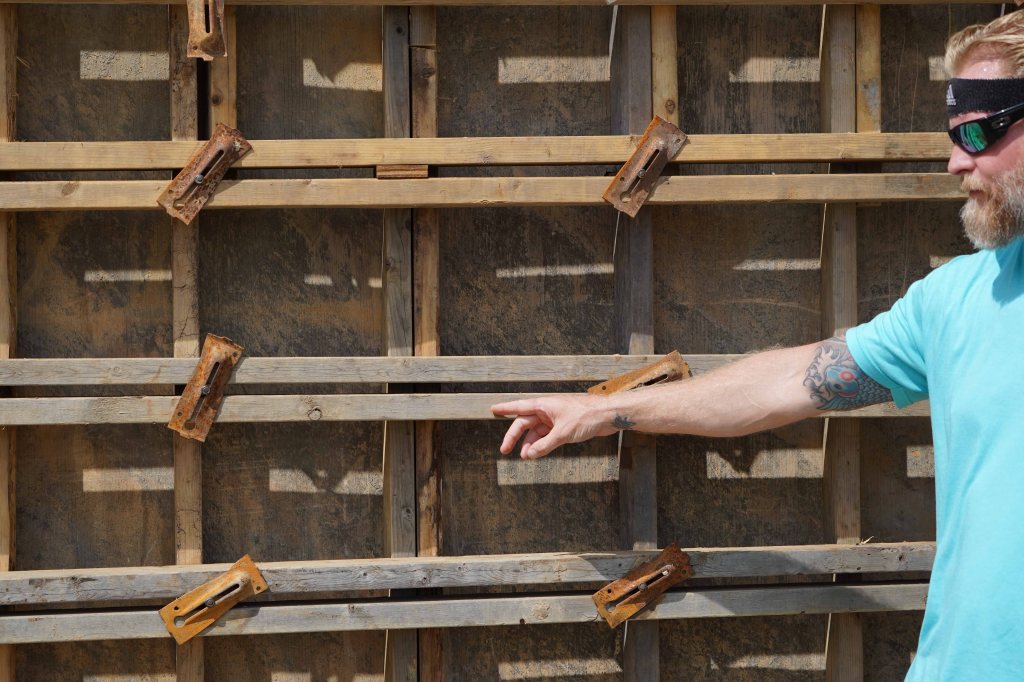 This once again creates 1’ squares all the way around the forms, like with the rebar. The walers are tightened into place with metal plates called hairpins.