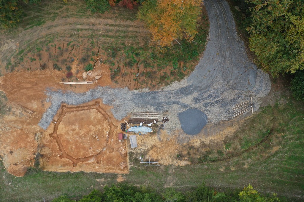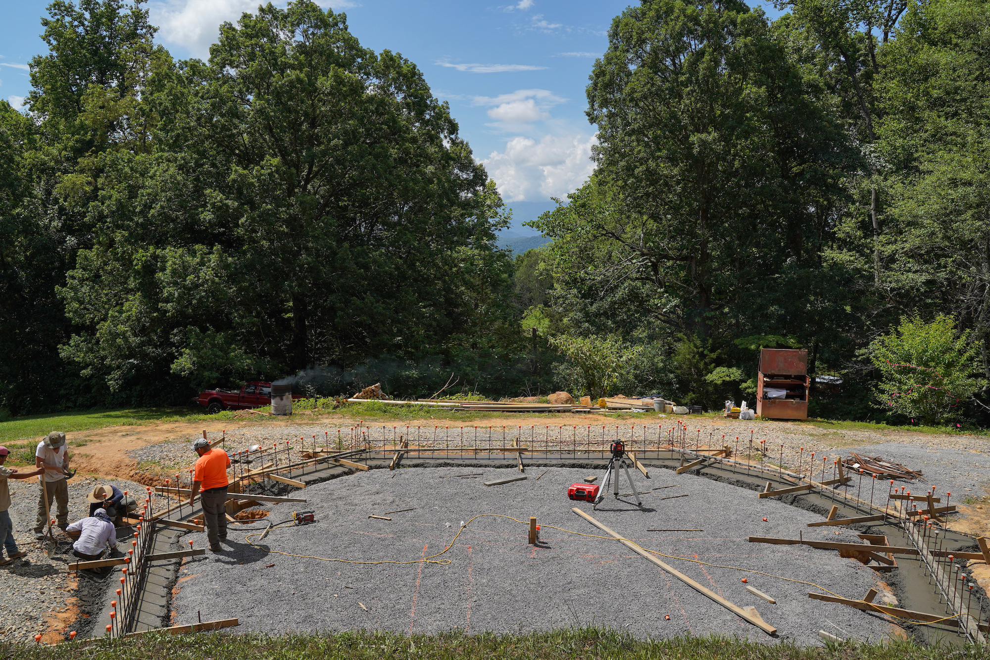 A year and a half after we dug a 24” wide and deep decagon-shaped trench for the dome’s footer, our General Contractor Doug said he was wrapping up a 2-year project and ready to come work with us again.