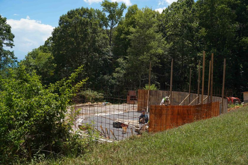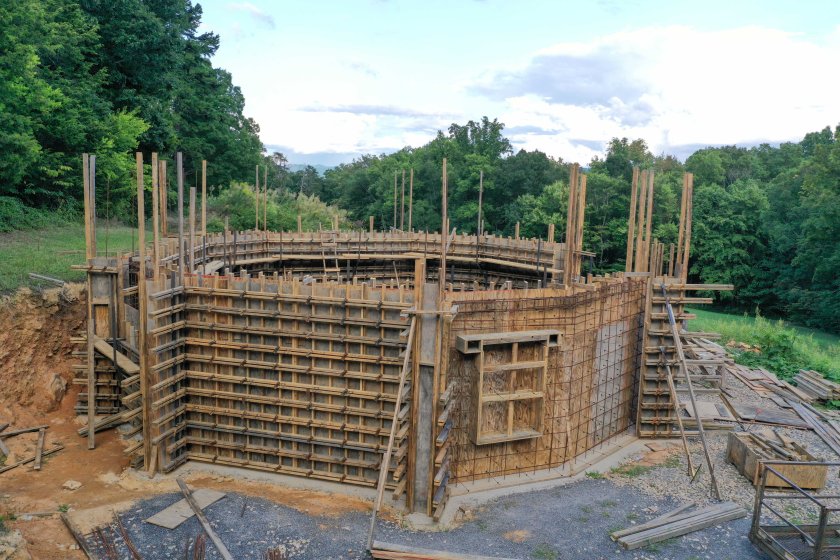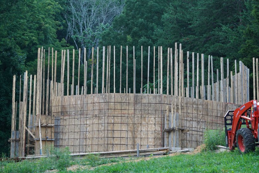 Not every dome has a basement, and the kit doesn’t include the materials for the walls, but the kit vendor suggested 3 options: concrete block, ICF, or poured concrete. Working with block on a dome is a nightmare because so many blocks have to be cut to custom angles. ICF was ruled out because contractors around here don’t like working with it. We heard it didn’t stand up as well as concrete in Gatlinburg during the 2016 fires either. That left poured concrete.