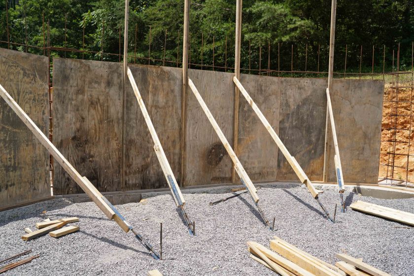 Each piece of plywood has holes drilled so long-tail wall ties can be placed through for even more support.