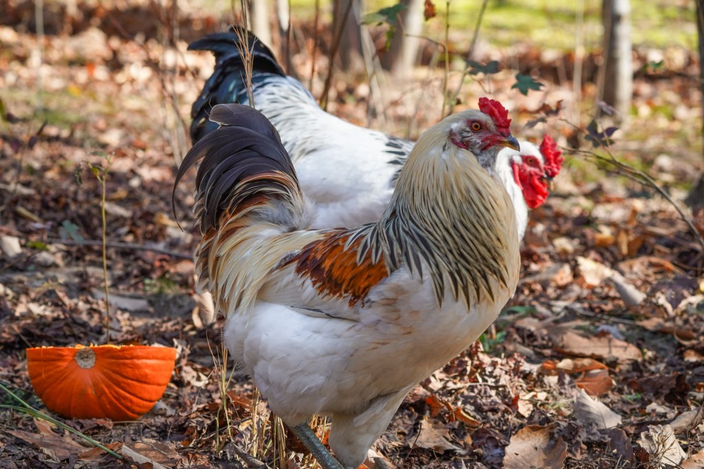 They’re both in high puberty and it’s surprising how well they’re getting along, based on what books and the internet say. Those same sources say space is key, and space, they have. Three coops, 2K square feet of yard, lots of places to eat, drink, hide out, nest, nap, though they often orbit peacefully within 5′ of each other.