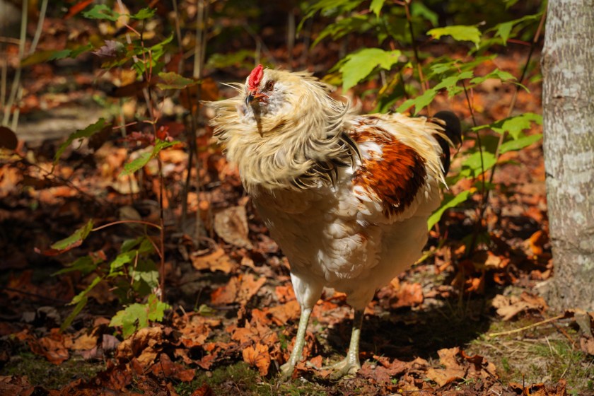 I’ll repeat the standard preamble: roosters are SO interesting. We have 2: Light Brahma Cogburn, a big, strong, aggressive guy who rules the yard with an iron beak, but he does have a nice, low crow you can barely hear in the house…