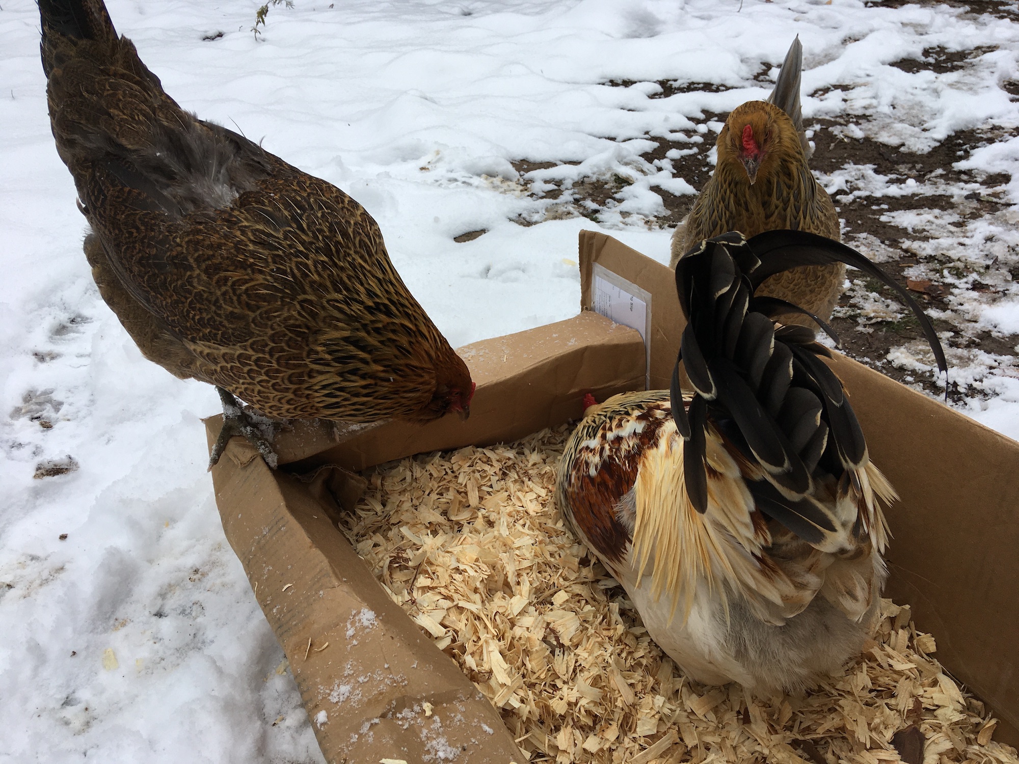 The tractor’s run has a wire floor, so it wasn’t possible to dig out their wet ground. I fetched the box of pine shavings from the dog crate in the study. The plan was to pour the shavings into the run, but the box was a hit (2 weeks later, it’s still in the tractor; chickens love taking naps in the cardboard box).