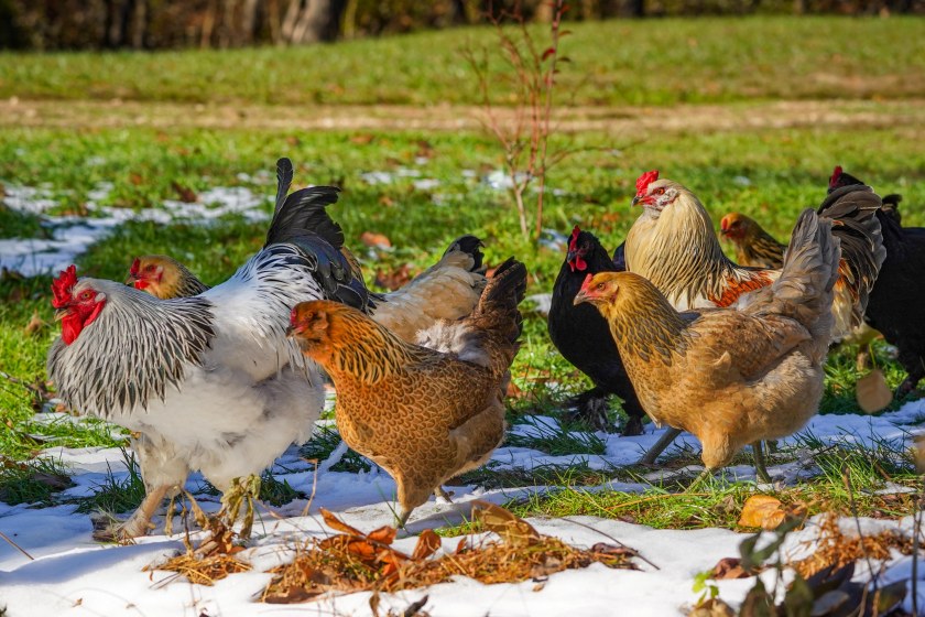 It’s always better to let a chicken be a chicken if you can. If her feathers could dry off, they might cover the bald spot, but humidity that afternoon was 95%. Even if I shut the birds in their covered runs against the unrelenting snow-rain, how would she be dry by the time it hit freezing? One other concern that was almost too much to think about: what if none of the chickens were dry enough to safely stay outside? Did I need to start toweling birds right now and hope for the best? I walked back through the wind and slush to think it over with the birds.