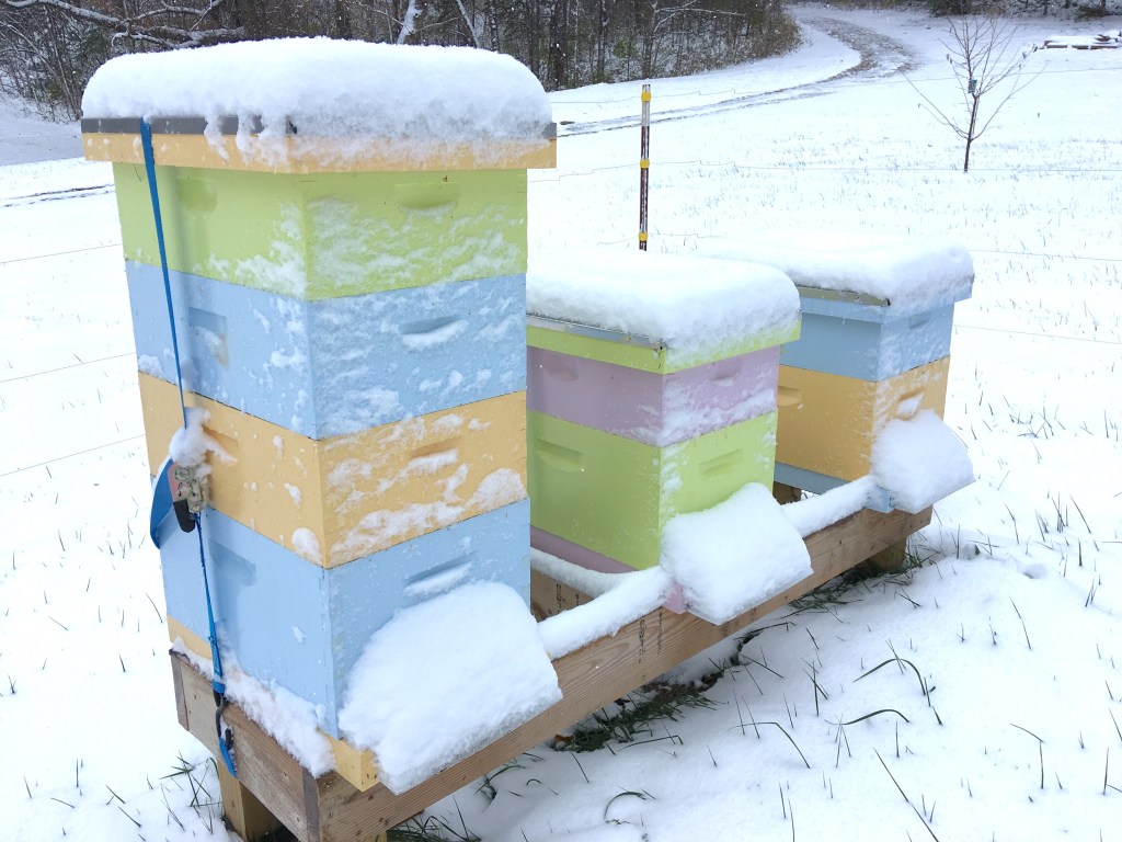 Many beginning beekeepers overwinter Langstroth hives with just 2 boxes: one, big “brood box” on the bottom, where the colony raises new bees, and a smaller box of honey frames on top, called a “honey super.” General wisdom says a single super is enough for a hive to survive winter. But on that tallest hive, we figured the extra food would mean a better chance of coming into 2021 strong. The downside? No honey for us, but we were fine delaying the gratification – and the hard work of a honey harvest – if it meant a good hive-survival rate.